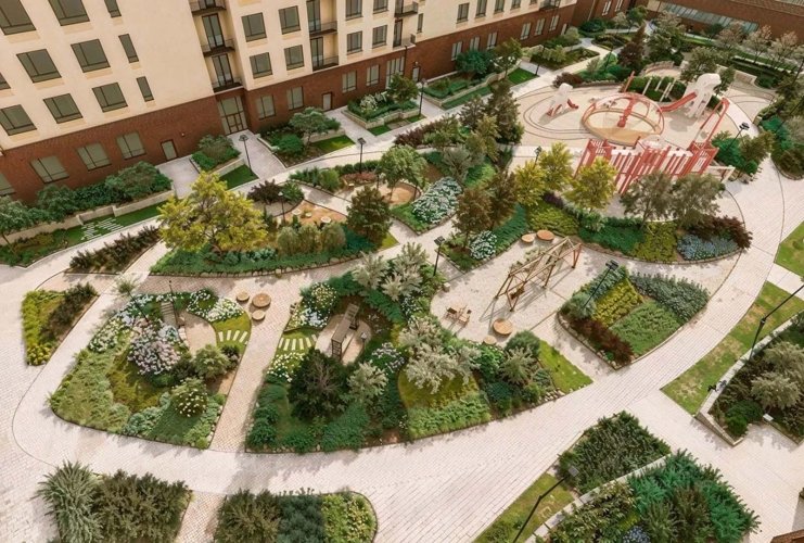 Двор представляет собой замкнутое пространство, с разнообразными детскими игровыми, спортивными площадками, зонами отдыха.