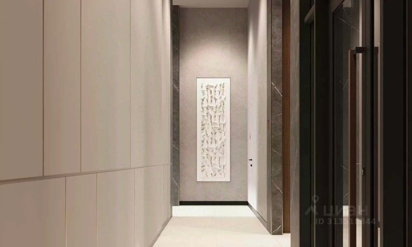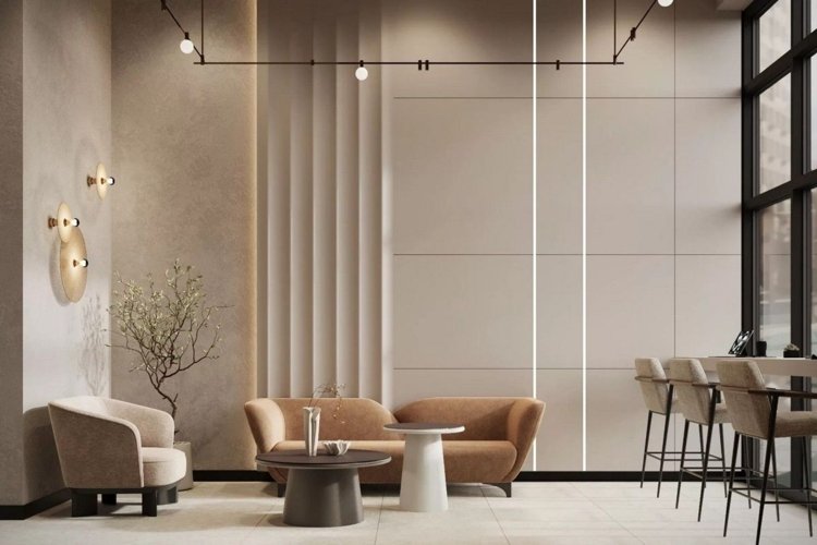 Холлы проекта сквозные, оформлены в едином стиле: светлые пространства с отделкой под дерево и камень, мягкие пуфы.