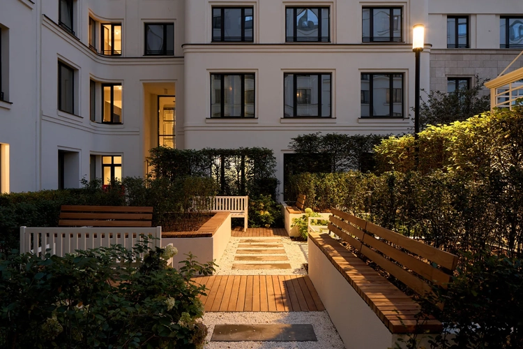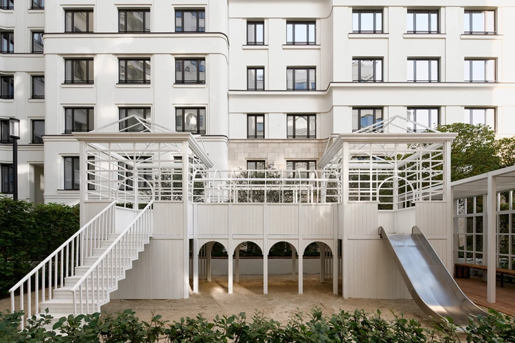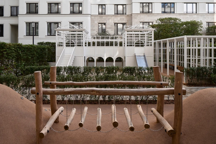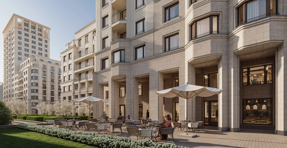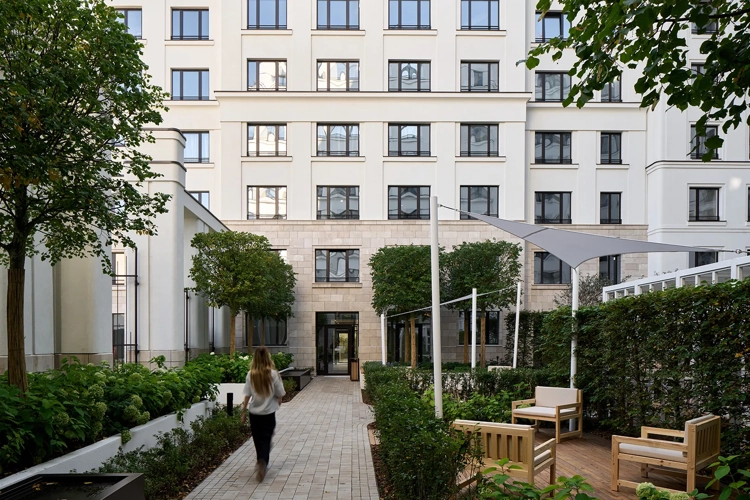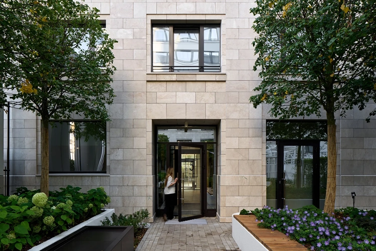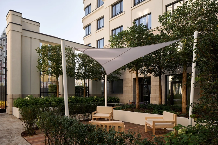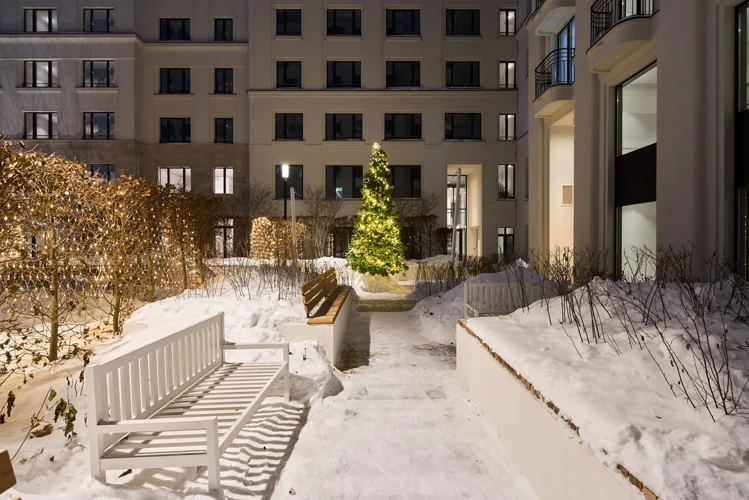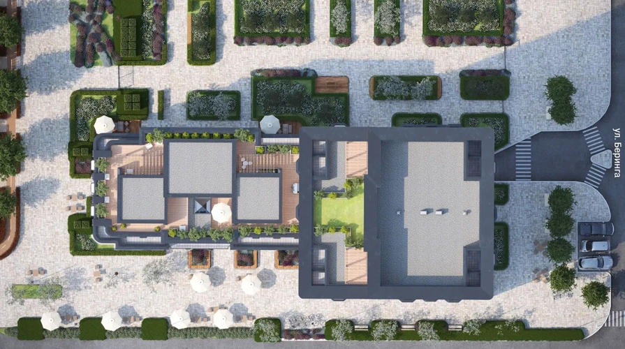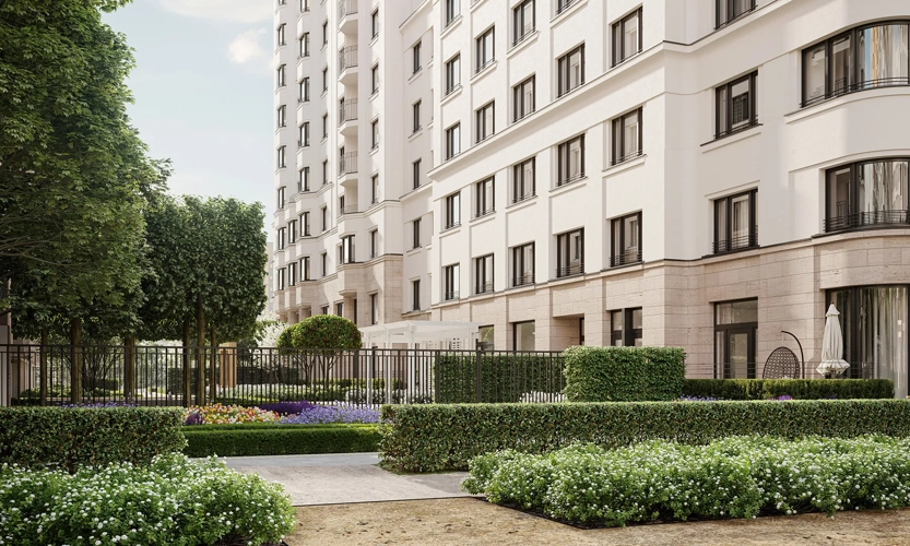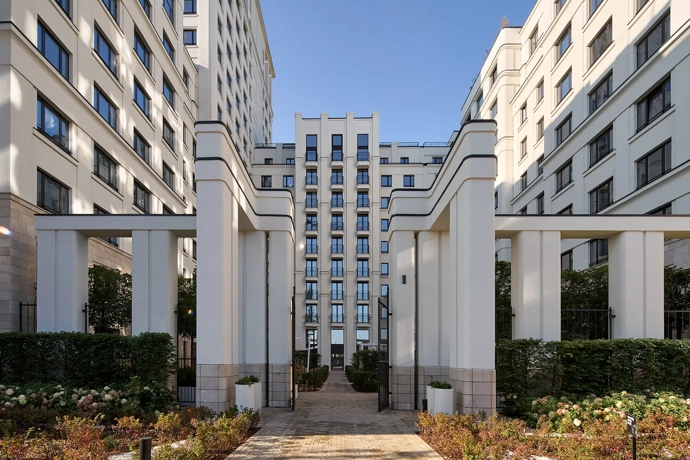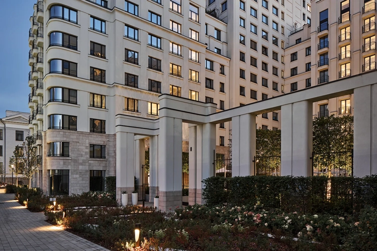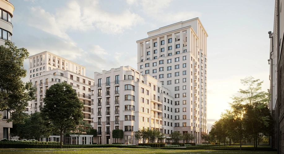 Жилой комплекс представляет собой полузамкнутый квартал высотой 9-17 этажей с подземным паркингом. Во внутреннем дворе, образованном массивом здания, нет уличного шума и ветра. Переменная этажность дома делает двор и квартиры светлыми.